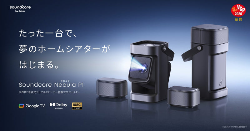 世界初※着脱式デュアルスピーカー搭載プロジェクター 「Soundcore Nebula P1」が新登場。自由に配置できるスピーカーによる双方向からの立体音響と、650ANSIルーメンの高輝度映像で、音に包まれる真の没入体験を実現。ワイヤレス...