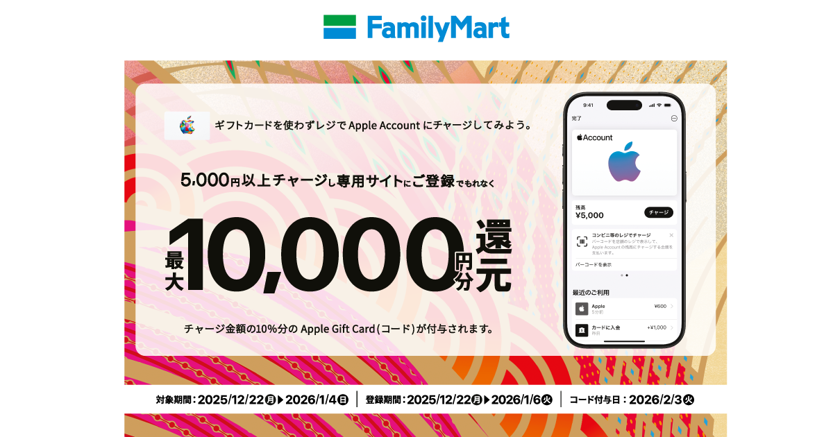 キャンペーン期間中、ファミリーマート各店舗のレジにて、Apple Accountへ合計5,000円以上をチャージし、チャージ時のレシートを本キャンペーン専用サイトからご登録いただくと、合計チャージ金額の10%分(最大10,000円分)のAp...