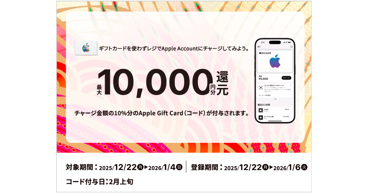 レジでApple Accountに累積5,000円以上チャージし、チャージ時のレシートをアップロードのうえ登録後、累積チャージ金額の最大10%分(最大10,000円分)のApple Gift Card(コード)をプレゼント!