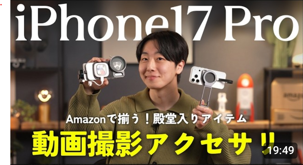 iPhone17 Pro:撮影用アクセサリーを3種類 accessory 2026.03.31 提供 : アマゾンジャパン合同会社 動画タイムライン 0:00今回の動画は「Amazon Studio」での撮影です 今回紹介した商品 きすけ/ガジェットの本音のAmazonページ - iPhone17 Pro撮影アクセサリーwww.amazon.co.jpできすけ/ガジェットの本音のおすすめ商品をお買い求めください。きすけ/ガジェットの本音のお気に入り商品について詳しくはこちら。